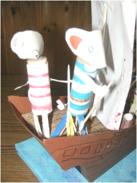 A Szélkirálynő kartonból, hungarocellből és parafalapból készült, az árboc hurkapálcából, a tenger és a part festett papírral borított hungarocellből.